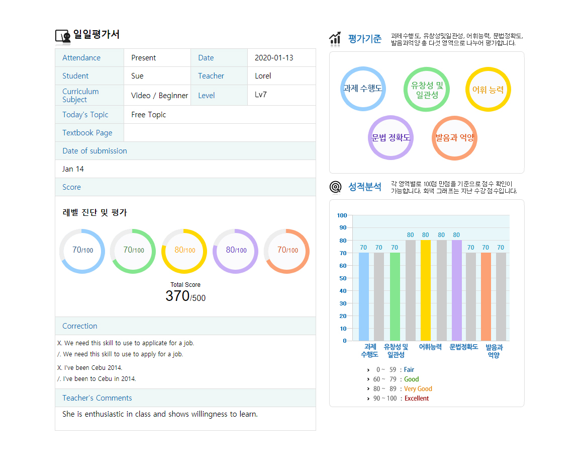 수업중에 틀린 문장, 발음, 어휘, 표현 등을 강사가 그때 그때 평가하여 주는 서비스이며 그 체크된 내용을 내강의실에서 좀 더 자세하게 확인할 수 있습니다.