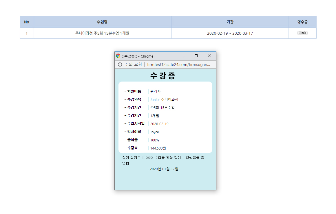 현재 수강중인 수업과 종료된 수업에 관련된 기본 정보를 확인할 수 있으며, 신청일 기준으로 영수증 출력이 가능합니다.